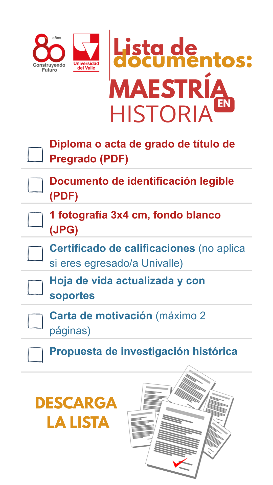 De acuerdo con la normativa de la Universidad del Valle el programa de Maestría en Historia cuenta con los siguientes: