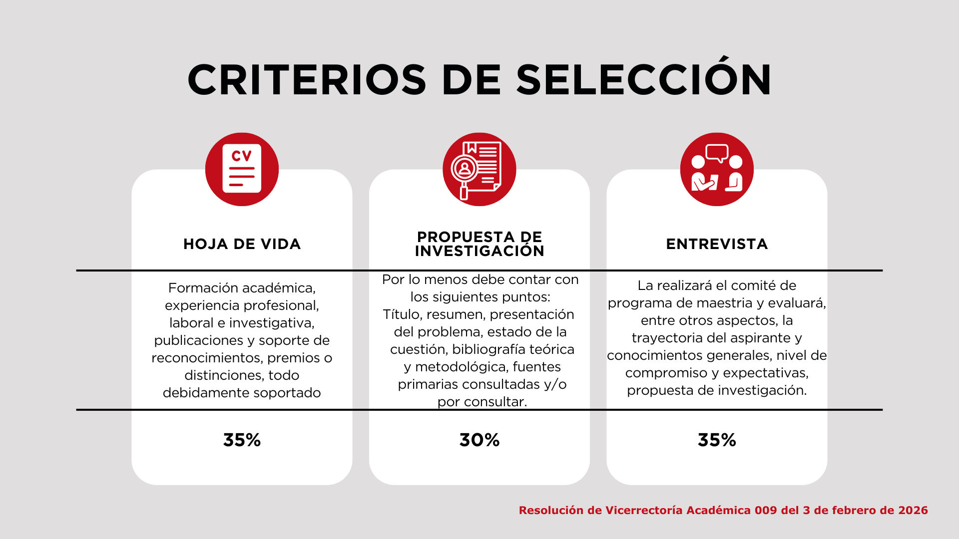 La admisión al programa es anual y se encuentra reglamentada por la Resolución 009 del 3 de febrero de 2026 de la Vicerrectoría Académica.