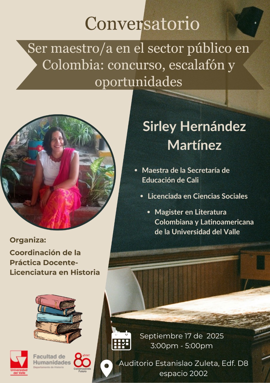 El Departamento de Historia y la Coordinación de la Práctica docente-Licenciatura en Historia invita al conversatorio Conversatorio er maestro/a en el sector público en Colombia: concurso, escalafón y oportunidades con la maestra de la Secretaría de Educación de Cali, Sirley Hernández Martínez.
